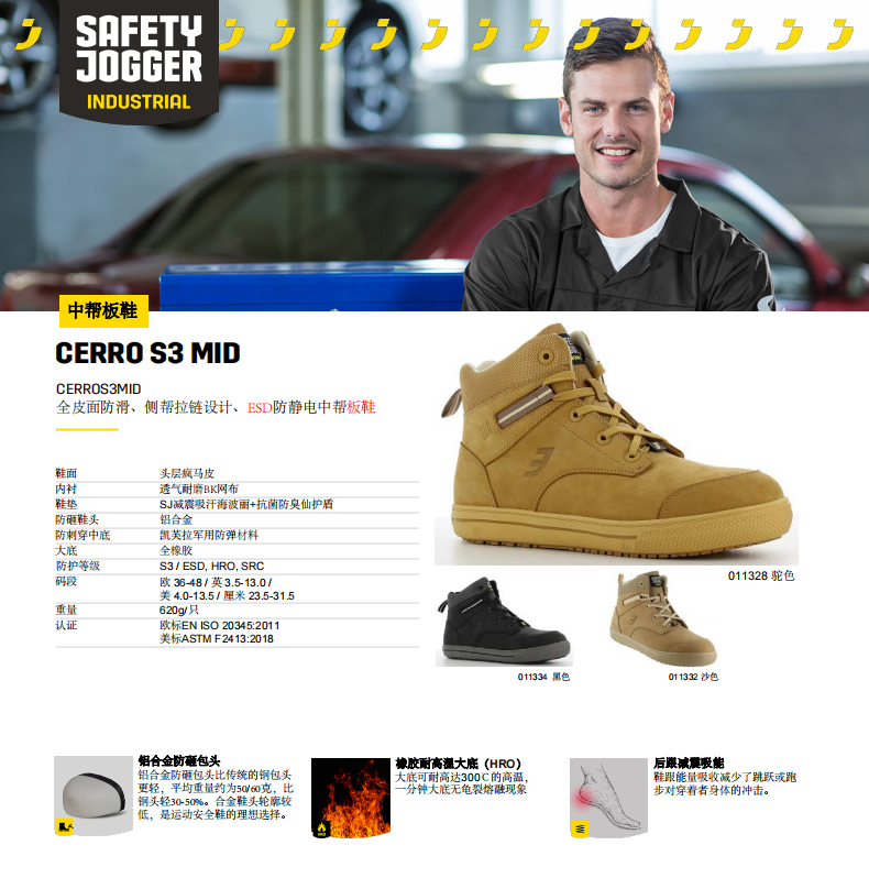 产品名称:Safety Jogger//鞍琸宜 CERRO S3 MID 011328 防砸防刺防静电 驼色中帮板鞋